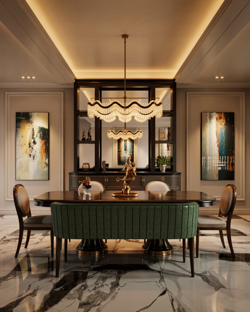 “Our living and dining spaces used to feel disconnected. Dazzling Interiors created a fluid design with color continuity, wall textures, and a dining mirror feature that opened up the space. Now it feels like one seamless, luxurious experience.”