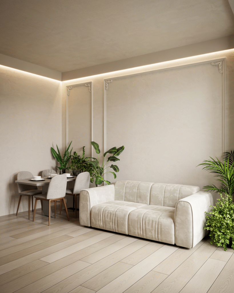 “I wanted a minimal yet cozy living room where I could unwind after work. The team designed a soft-toned palette with a velvet sofa, subtle wall moulding, and warm lights. The dining area got a full makeover with compact seating and a floating crockery unit.”