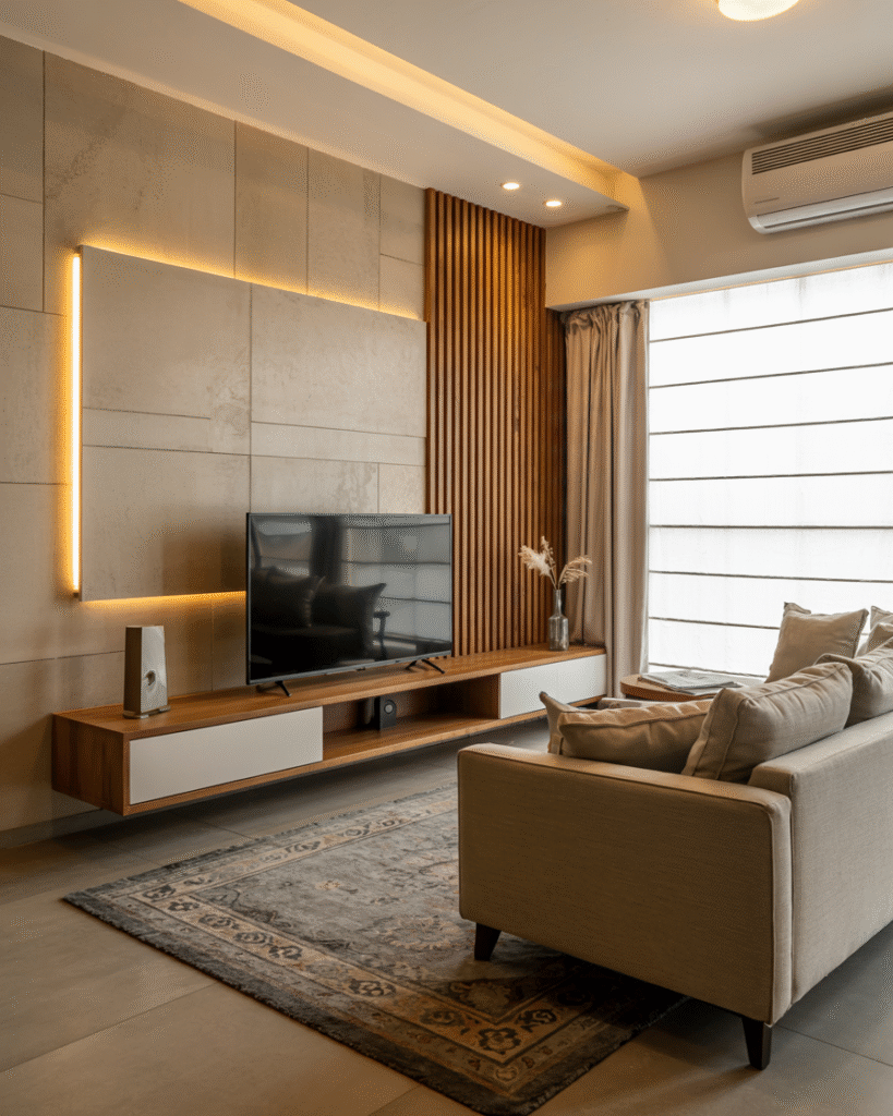 “Our builder flat felt boxy, so we asked for a feature wall and a soft divider. Dazzling created a wooden slat panel near the entrance and a wall with hidden lighting behind the TV.”