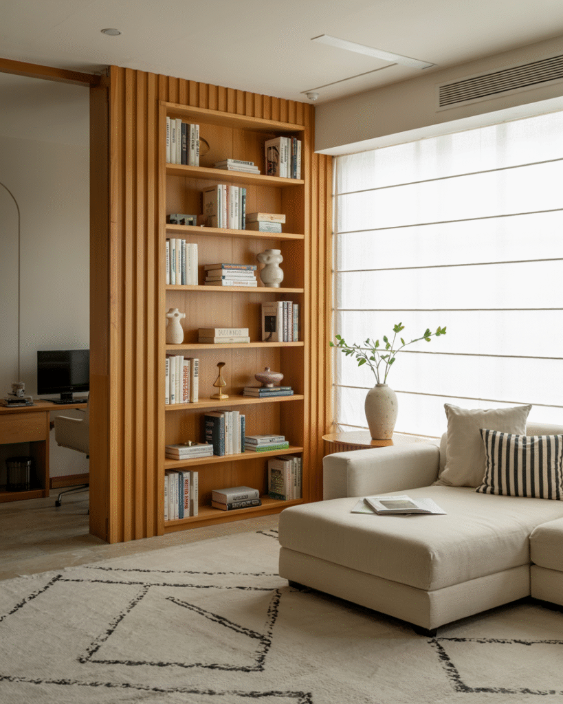 “I needed to separate my home office from the living area without closing it off. Dazzling Interiors installed a fluted wood divider with built-in shelving. Now I have privacy, style, and storage — all in one.”