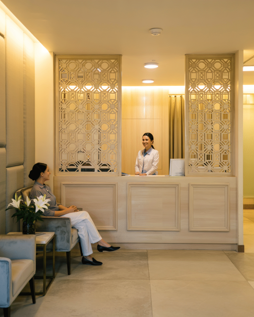 “We wanted our reception area to feel open but still defined. The team used jali-style paneling with backlighting that gives privacy and elegance without making it feel closed.”